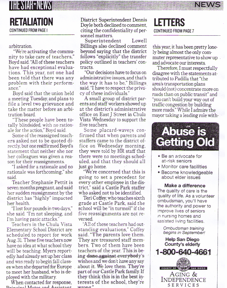 | < < < This ad is interesting. Perhaps it helps to explain why the Chula Vista Star-News has been willing to toss aside any claim it might have to journalistic ethics in its efforts to protect Pamela Smith, CVESD trustee and director the County of San Diego Aging & Independence Services. |
