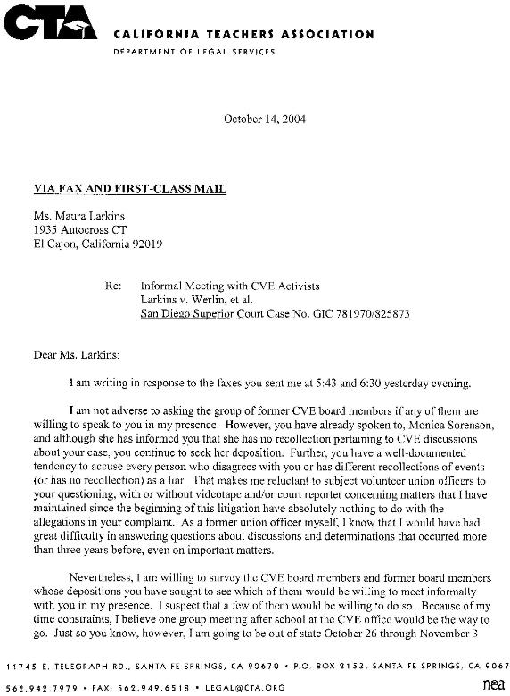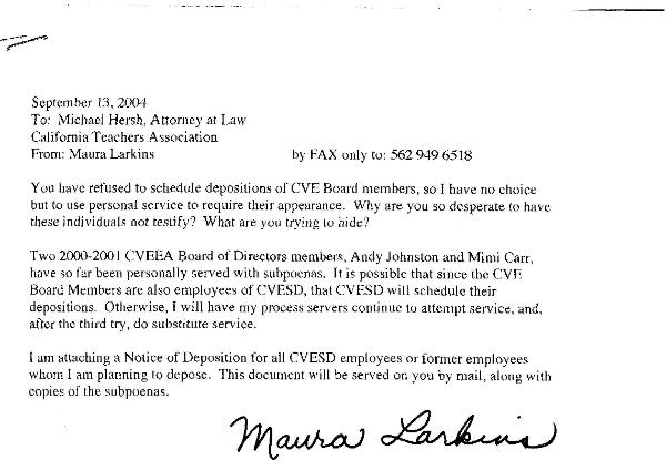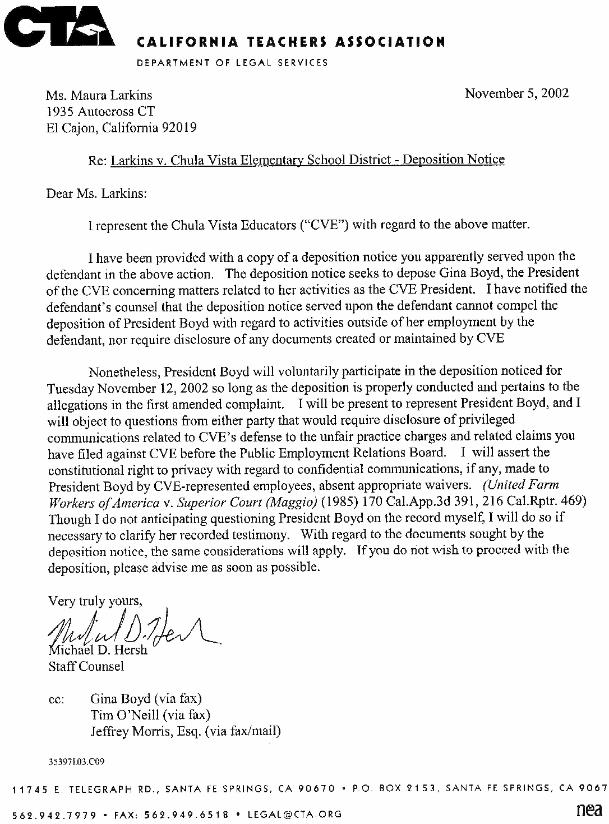 | "I have been provided with a copy of a deposition notice you apparently served upon the defendant in the above action. The deposition notice seeks to depose Gina Boyd, the President of the CVE concerning matters related to her activities as the CVE President. I have notified the defendant's counsel that the deposition notice served upon the defendant cannot compel the deposition of President Boyd with regard to activities outside of her employment by the defendant [CVE was claiming that Boyd's employer was Chula Vista Elementary School District when Boyd was on leave from the district to work as president of Chula Vista Educators], nor require disclosure of any documents created or maintained by CVE." |