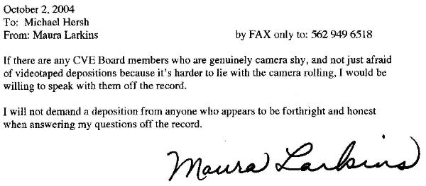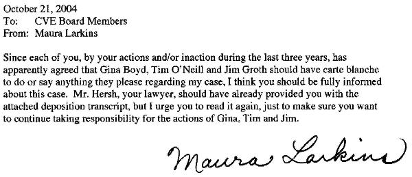 | Gina Boyd's deposition did not occur until 2004, at which time Michael Hersh instructed Boyd not to answer any questions regarding Boyd's or CVE actions regarding Maura Larkins. |