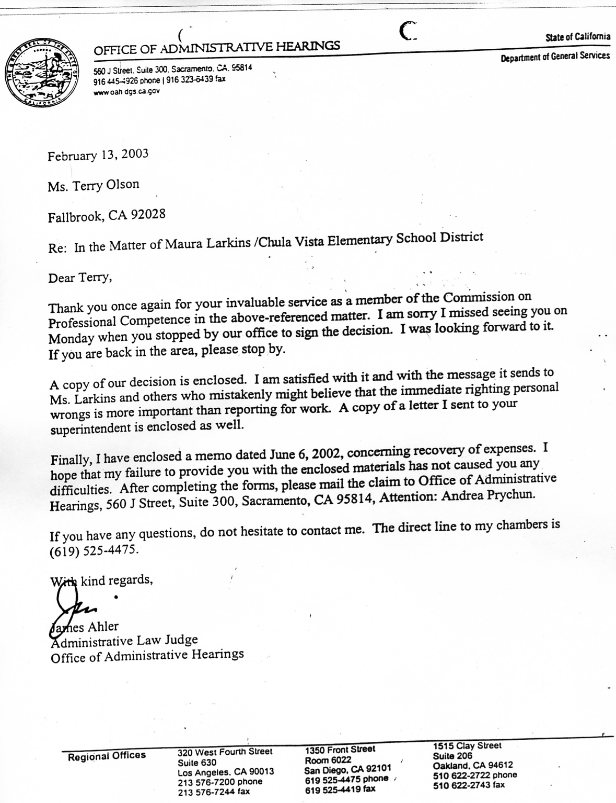 | Judge James Ahler made it clear in his decision that he did not have ANY CONCERN AT ALL for Maura Larkins' students who lost their teacher On Feb 12, 2001, in the middle of their critical transition year to English-only instruction, Maura Larkins' students were given a series of substitutes who knew very little about how to teach that class. Judge Ahler claimed that it was perfectly acceptable that the district took Maura Larkins out of her classroom for seven weeks, then, after asking Maura Larkins twice to come back during that school year, each time demanded that she leave again. Judge Ahler had before him evidence that Asst. Superintendent Rick Werlin was running around desperately looking for someone who would make an allegation against Maura Larkins. Gretchen Donndelinger's notes showed how hard he tried, and how unsuccessful he was. Attorney Mark Bresee of Parham & Rajcic either instructed or advised Werlin to violate the law again and again, or was willing to accept taxpayer money for covering up school district wrongdoing, or both. James Ahler clearly did not care about Maura Larkins' students, yet he dishonestly pretended to care about STUDENTS IN A CLASS AT A DIFFERENT SCHOOL WHO NEVER MET MRS. LARKINS! |