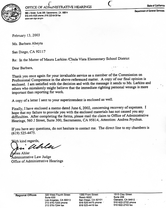 | Barbara Abeyta, representative, National City Elementary Teachers Association, signed the decision as OAH panelist in the Maura Larkins case. The California attorney general's office reported to Maura Larkins that Ms. Abeyta, in serving on the OAH panel, felt an obligation as a union representative. Clearly, Ms. Abeyta felt no obligation to honor the rights of a fellow teacher, only to be loyal to the union. Questions for Barbara Abeyta 1) Did CTA pressure you to keep quiet? 2) Did Mary Kay Rosinski arrange for CTA Attorney Emma Lehaney to help you get out of testifying in the Schulman case? |