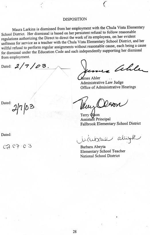 | The Falsely-Dated Decision Page of the 28-Page Decision of the Maura Larkins' Case at the Office of Administrative Hearings; Olson and Abeyta signed it without discussing or even seeing the "findings of fact." |