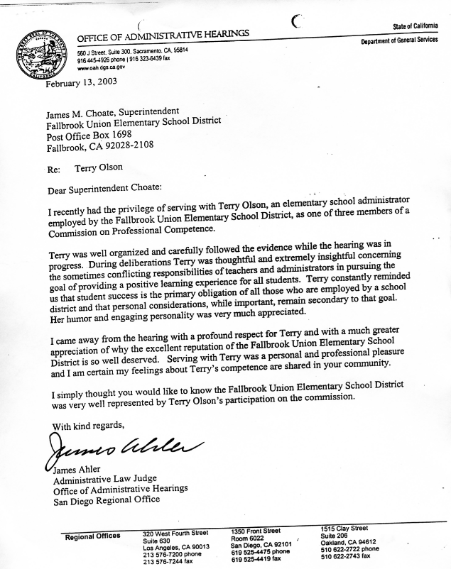 | What did Barbara Abeyta and Terry Olson get for being docile, cooperative and supportive of Judge Ahler's arbitrary and illegal actions? They got the almost identical letters below sent to their school district superintendents. |